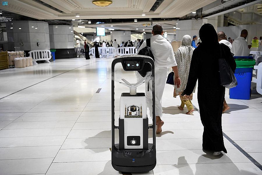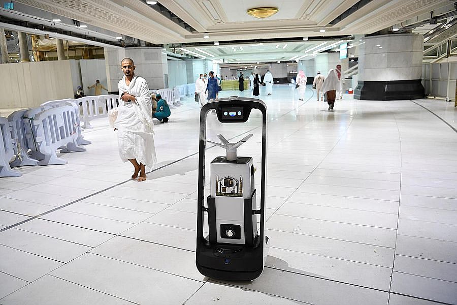 ولفت إلى توافر الروبوتات الذكية التي تعمل بالذكاء الاصطناعي داخل المسجد الحرام والتي لا تحتاج لأي تدخل بشري، منها روبوتات للتعقيم والتطهير، وروبوتات توجيهية تعمل على توجيه الزوار والمعتمرين بكيفية أداء المناسك، والإفتاء والإجابة على السائلين، مع إمكانية إضافة الترجمة الفورية للغات العالمية والتواصل مع المشايخ عن بُعد، كذلك روبوت توزيع الهدايا لقاصدي المسجد الحرام وهو روبوت ذكي مزود بشاشة مع سماعات صوت يمكن تغييرها وتعديلها في أي وقت ويعمل بمستشعرات ثلاثية الأبعاد لتجنب الاصطدام بالأجسام ونظام ملاحة تلقائي.