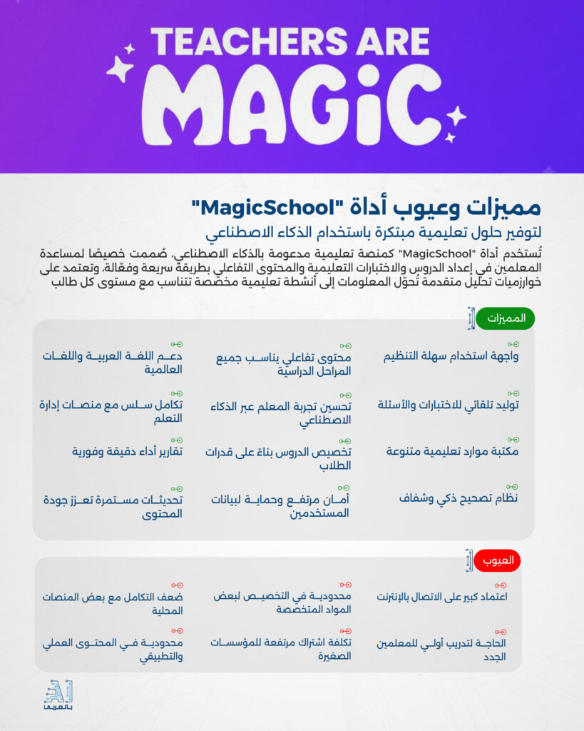تُستخدم أداة “MagicSchool” كمنصة تعليمية مدعومة بالذكاء الاصطناعي، صُممت خصيصًا لمساعدة المعلمين في إعداد الدروس والاختبارات التعليمية والمحتوى التفاعلي بطريقة سريعة وفعّالة، وتعتمد على خوارزميات تحليل متقدمة تُحوّل المعلومات إلى أنشطة تعليمية مخصصة تتناسب مع مستوى كل طالب، مما يجعلها خيارًا مثاليًا في التعليم الحديث القائم على التخصيص والتفاعل.