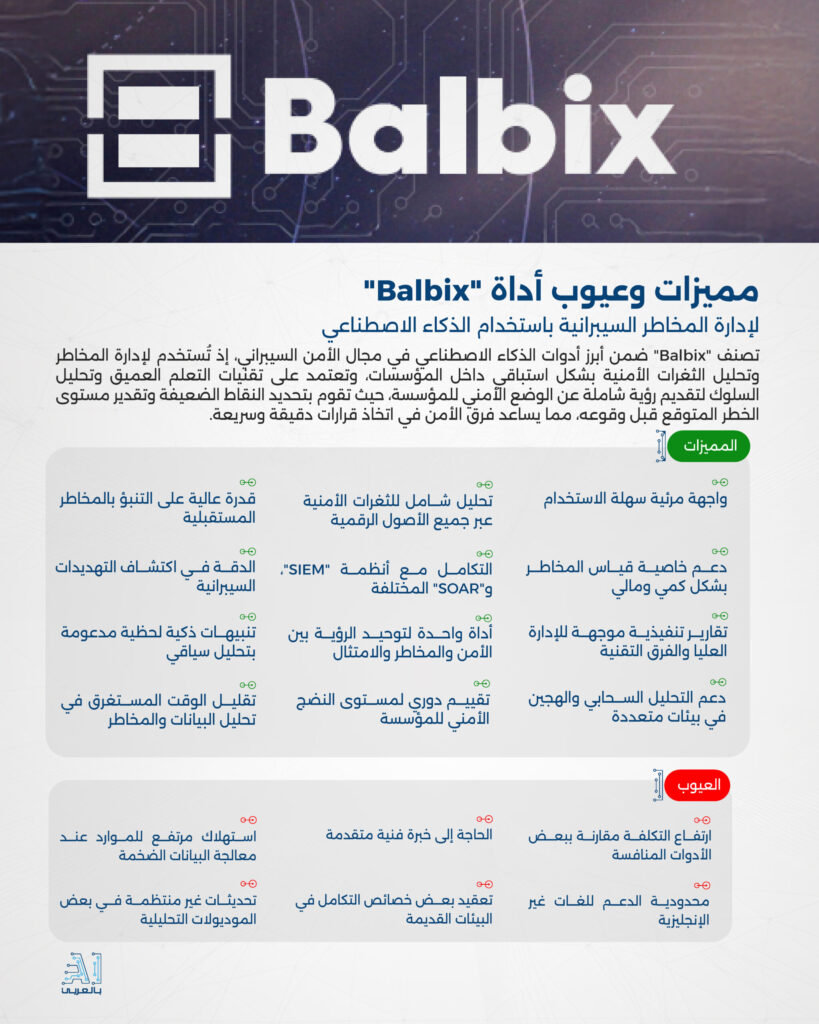 تصنف “Balbix” ضمن أبرز أدوات الذكاء الاصطناعي في مجال الأمن السيبراني، إذ تُستخدم لإدارة المخاطر وتحليل الثغرات الأمنية بشكل استباقي داخل المؤسسات، وتعتمد على تقنيات التعلم العميق وتحليل السلوك لتقديم رؤية شاملة عن الوضع الأمني للمؤسسة، حيث تقوم بتحديد النقاط الضعيفة وتقدير مستوى الخطر المتوقع قبل وقوعه، مما يساعد فرق الأمن في اتخاذ قرارات دقيقة وسريعة.