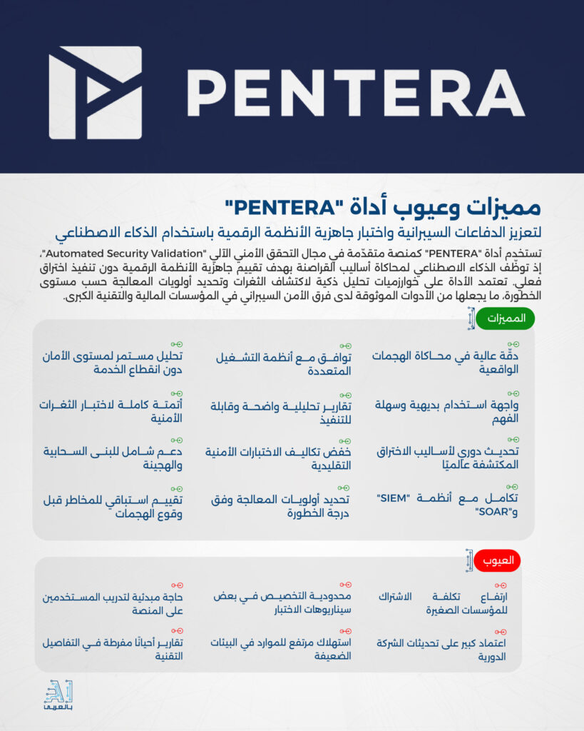 تستخدم أداة “PENTERA” كمنصة متقدّمة في مجال التحقق الأمني الآلي “Automated Security Validation”، إذ توظّف الذكاء الاصطناعي لمحاكاة أساليب القراصنة بهدف تقييم جاهزية الأنظمة الرقمية دون تنفيذ اختراق فعلي. تعتمد الأداة على خوارزميات تحليل ذكية لاكتشاف الثغرات وتحديد أولويات المعالجة حسب مستوى الخطورة، ما يجعلها من الأدوات الموثوقة لدى فرق الأمن السيبراني في المؤسسات المالية والتقنية الكبرى.