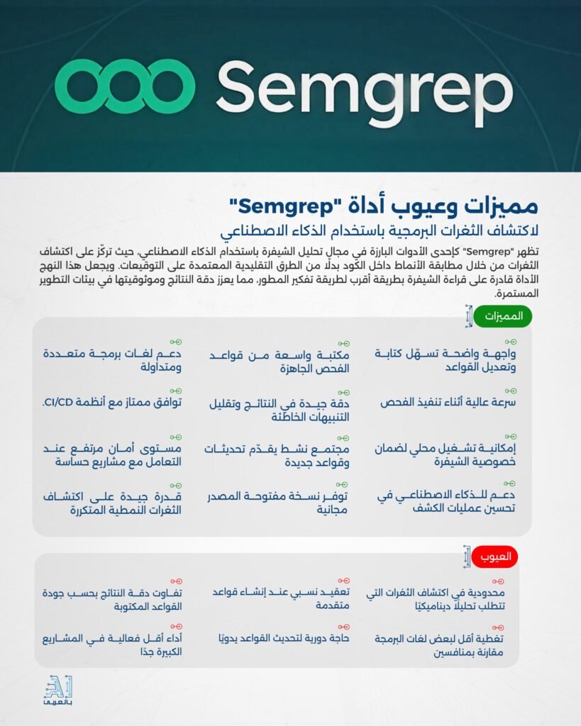تظهر “Semgrep” كإحدى الأدوات البارزة في مجال تحليل الشيفرة باستخدام الذكاء الاصطناعي، حيث تركّز على اكتشاف الثغرات من خلال مطابقة الأنماط داخل الكود بدلًا من الطرق التقليدية المعتمدة على التوقيعات. ويجعل هذا النهج الأداة قادرة على قراءة الشيفرة بطريقة أقرب لطريقة تفكير المطور، مما يعزز دقة النتائج وموثوقيتها في بيئات التطوير المستمرة.