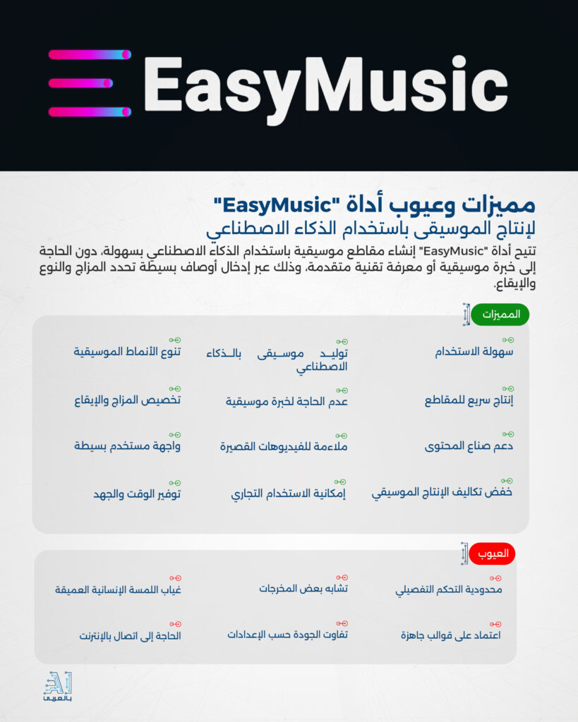 تتيح أداة “EasyMusic” إنشاء مقاطع موسيقية باستخدام الذكاء الاصطناعي بسهولة، دون الحاجة إلى خبرة موسيقية أو معرفة تقنية متقدمة، وذلك عبر إدخال أوصاف بسيطة تحدد المزاج والنوع والإيقاع.
