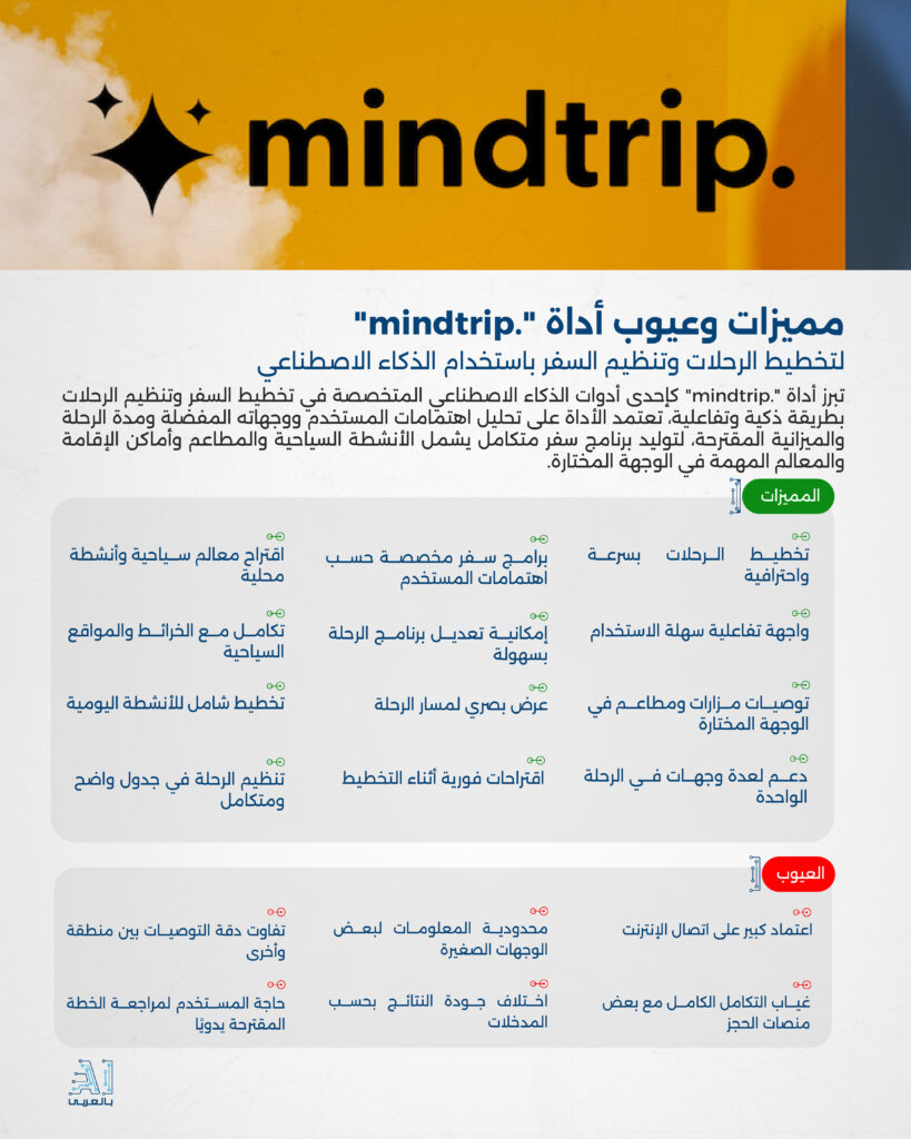 وتتميز “.mindtrip” بأنها تجمع بين التخطيط التفاعلي والبيانات السياحية الواسعة، حيث يستطيع المستخدم تعديل البرنامج بسهولة وإضافة الأنشطة أو حذفها وفق تفضيلاته الشخصية. كما توفر واجهة مرئية تساعد المسافر على تصور رحلته قبل تنفيذها، مع اقتراحات مبنية على الذكاء الاصطناعي لتحسين تجربة السفر وجعلها أكثر تنظيمًا ومرونة.