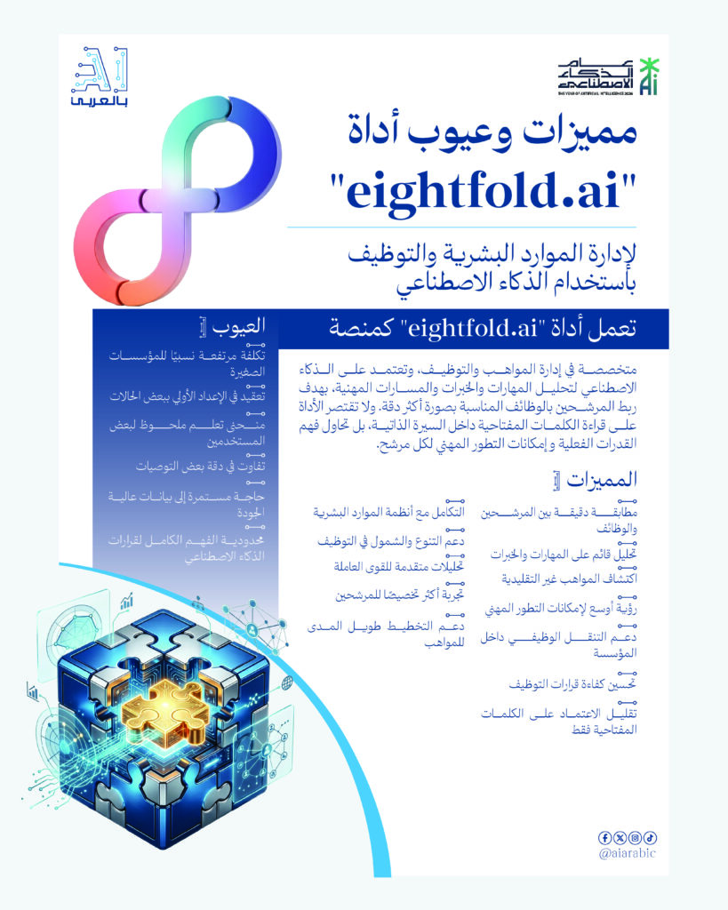 تعمل أداة “eightfold.ai” كمنصة متخصصة في إدارة المواهب والتوظيف، وتعتمد على الذكاء الاصطناعي لتحليل المهارات والخبرات والمسارات المهنية، بهدف ربط المرشحين بالوظائف المناسبة بصورة أكثر دقة. ولا تقتصر الأداة على قراءة الكلمات المفتاحية داخل السيرة الذاتية، بل تحاول فهم القدرات الفعلية وإمكانات التطور المهني لكل مرشح.