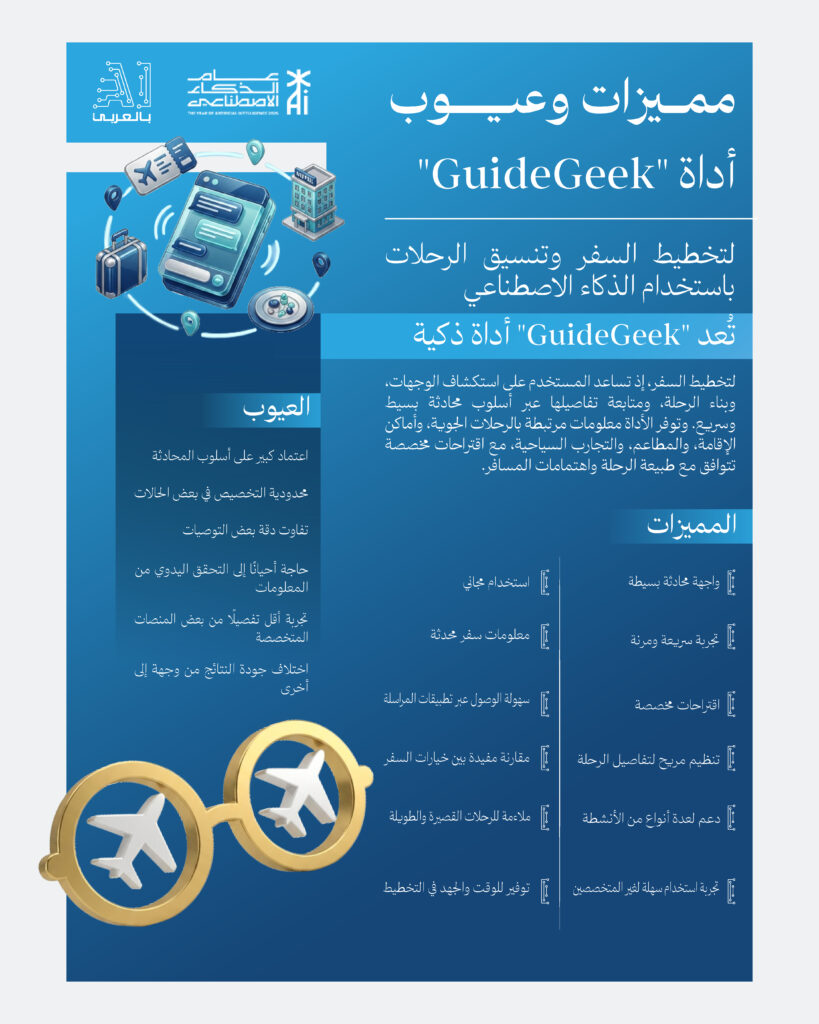 تُعد “GuideGeek” أداة ذكية مخصصة لتخطيط السفر، إذ تساعد المستخدم على استكشاف الوجهات، وبناء الرحلة، ومتابعة تفاصيلها عبر أسلوب محادثة بسيط وسريع. وتوفر الأداة معلومات مرتبطة بالرحلات الجوية، وأماكن الإقامة، والمطاعم، والتجارب السياحية، مع اقتراحات مخصصة تتوافق مع طبيعة الرحلة واهتمامات المسافر.