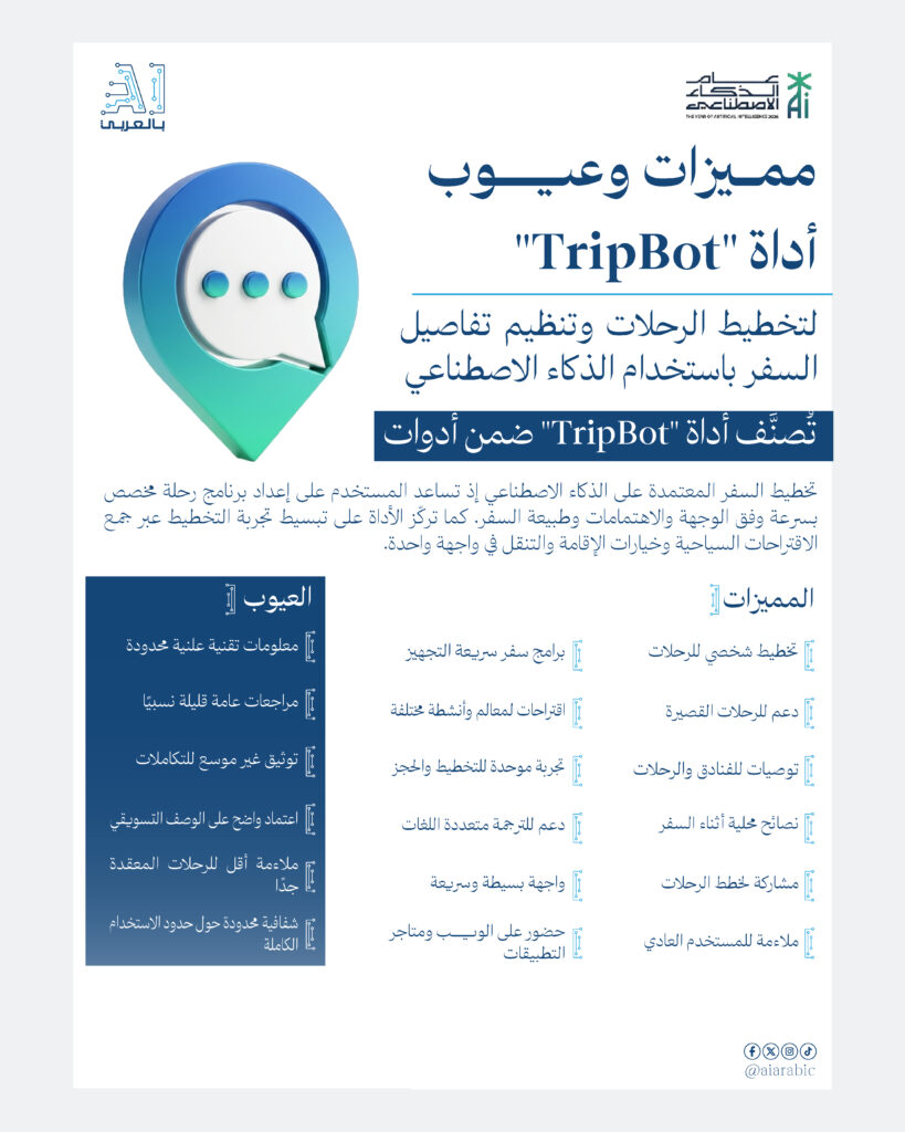 تُصنَّف أداة “TripBot” ضمن أدوات تخطيط السفر المعتمدة على الذكاء الاصطناعي إذ تساعد المستخدم على إعداد برنامج رحلة مخصص بسرعة وفق الوجهة والاهتمامات وطبيعة السفر. كما تركّز الأداة على تبسيط تجربة التخطيط عبر جمع الاقتراحات السياحية وخيارات الإقامة والتنقل في واجهة واحدة.